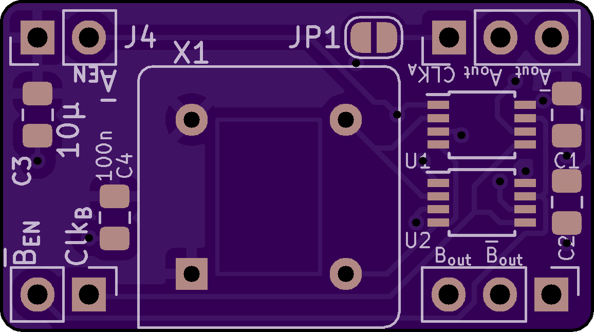 This drives two parallel outputs from a single clock input, an Inverted and a non-inverted. One clock could be from a through hole crystal oscillator and NOT bridging the solder jumper at the top. You could also dispense with the crystal oscillator and supply your own clock input through the CLK_A input and bridge the solder jumper. Clk_B is always supplied from an external input. Lastly the Pins are placed in breadboard style so you can put on a breadboard if you want.
