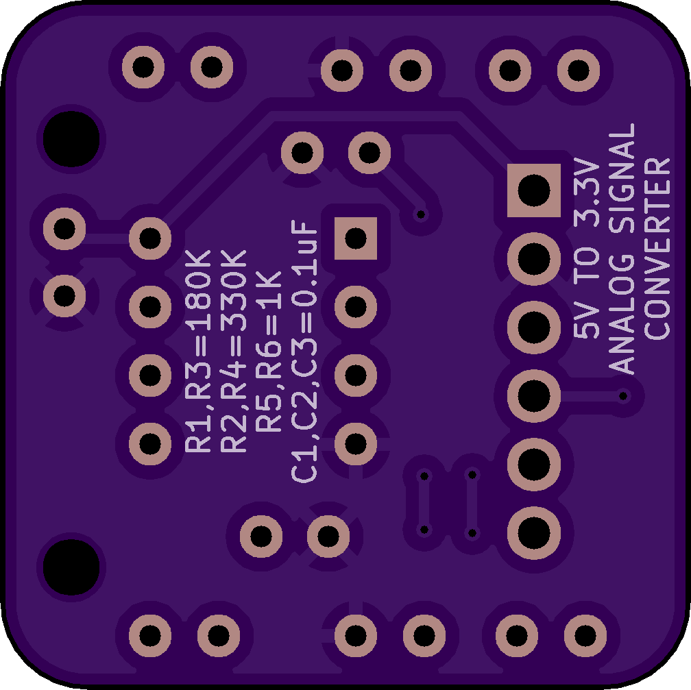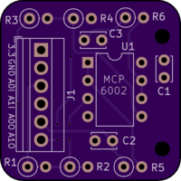 Two signal 5v to 3.3v analog converter with op-amp and low-pass filter. Values I used are printed on the board, but feel free to use whatever you need.